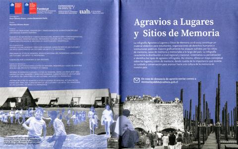 Folleto donde se informa de los lugares y sitios de memoria que han sido vandalizados entre los años 2018 a 2023 en las distintas regiones del país. Se detallan los tipos de lugares y sitios existentes, el tipo de rayado que sufrieron los lugres, los tipos de agravios existentes contra los sitios y cual es la importancia que poseen estos espacios de memoria.