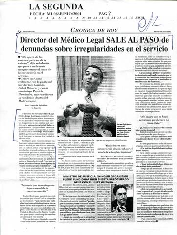 La noticia trata sobre la respuesta del director del Servicio Médico Legal, Jorge Rodríguez, frente a las irregularidades en el servicio, sumado a las razones del despido de la antropóloga Isabel Reveco Bastías y el cambio de puesto de trabajo de Patricia Hernández. Todo esto en el contexto de la investigación e identificación de osamentas de detenidos desaparecidos durante la dictadura. En un cuadro aparte, se muestra la opinión del Ministro de Justicia, José Antonio Gómez, referente al caso del SML.