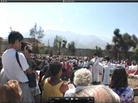Apertura 1994, sacerdotes leyendo en medio de una multitud de gente reunida dentro del recinto Villa Grimaldi.
