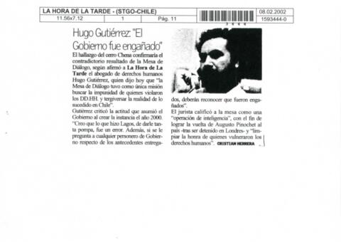 Nota de prensa donde se entrega la visión del abogado de derechos humanos Hugo Gutiérrez al respecto de los hallazgos de osamentas en el Cerro Chena y la Mesa de Dialogo.
