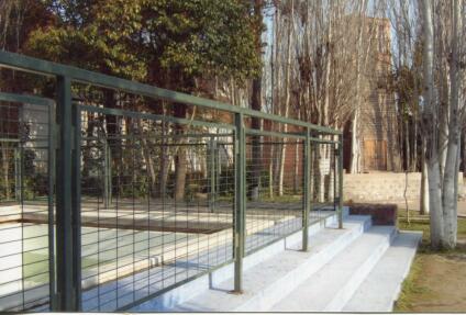 Imagen donde se visualiza la esquina de la piscina de Villa Grimaldi, se ve sus rejas y escalones. De fondo se ve La Torre rodeada de arboles.