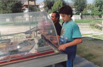 Imagen de un niño, un hombre y una mujer posicionando el domo que cubre la maqueta de Villa Grimaldi.