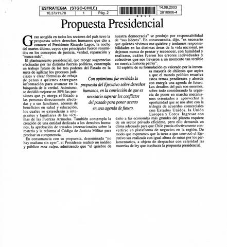 Nota de prensa que hace referencia al apoyo de todos los sectores políticos a la propuesta de Derechos Humanos del gobierno del presidente Ricardo Lagos. Se mencionan algunos puntos de la propuesta y se hace alusión a algunas palabras del presidente, como el mea culpa del presidente donde admite que el quiebre de la democracia se produjo por responsabilidad de sus líderes.