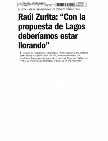 Reportaje acerca del nuevo libro de Raúl Zurita y su lanzamiento en el Museo de Bellas Artes. Esta nueva producción se llama "Inri" y lo escribió para dar homenaje y sepultura simbólica a los detenidos desaparecidos. También, existe un apartado dedicado a Paulina, pareja de Zurita. Zurita relata qué significó para él el 11 de septiembre de 1973 y comenta en qué se ha transformado la sociedad chilena como consecuencia de el golpe y la dictadura. Finalmente, entrega una reflexión acerca de la propuesta de derechos humanos del presidente Ricardo Lagos.