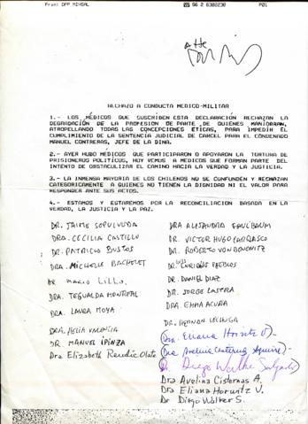 Declaración de profesionales de la medicina donde demuestran su rechazo por el apoyo de algunos médicos que participaron y apoyaron las torturas a presos políticos, degradando con esta acción a su profesión y su concepciones éticas. Actualmente demuestran su falta de ética obstaculizando que se haga justicia impidiendo la condena de Manuel Contreras.
