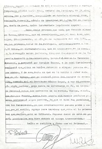 Declaración jurada de Silvia Tapia Fres quien cuenta como su conviviente Osvaldo Torres Albornoz fue detenido por carabineros y desde esa fecha no ha vuelto a saber de su paradero.