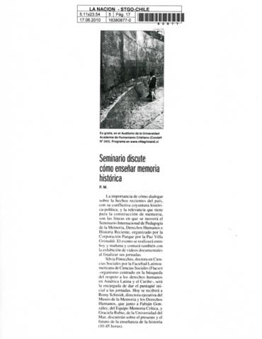 Nota de prensa que informa del Seminario que discute como enseñar memoria histórica y que es organizado por la Corporación Parque por la Paz Villa Grimaldi.